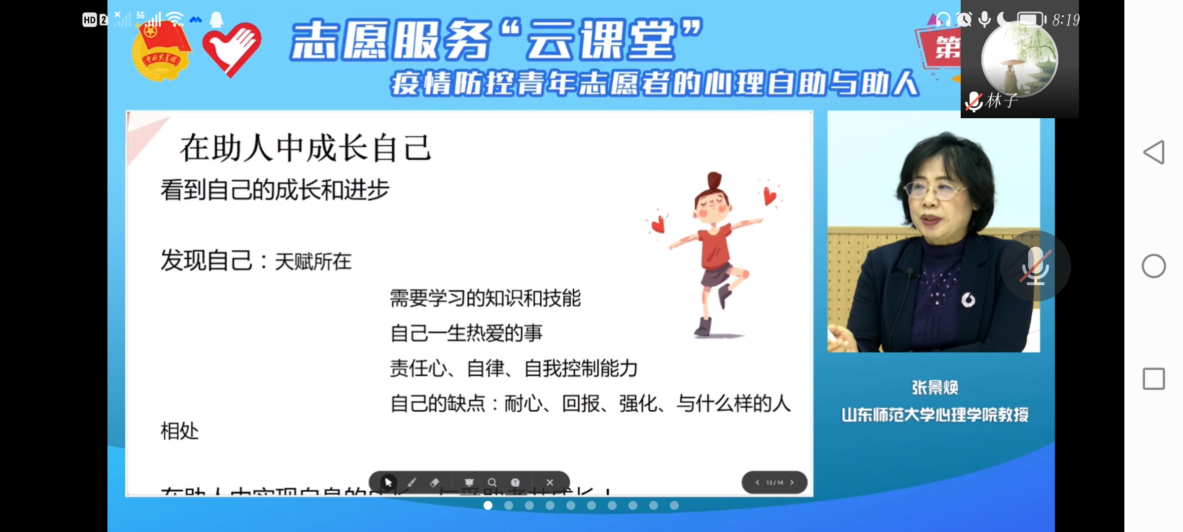 为进一步增强志愿者心理自助与助人能力,不断提升志愿服务水平,指导青年志愿者科学有序参与疫情防控工作,推进青年志愿服务组织体系建设,建立更加规范专业的疫情防控志愿服务队伍,3月29日,威廉希尔(WilliamHill)组织全体学生观看《疫情防控青年志愿者的心理自助与助人》专题讲座,本次讲座特别邀请山东师范大学心理学院张景焕教授作为宣讲嘉宾。