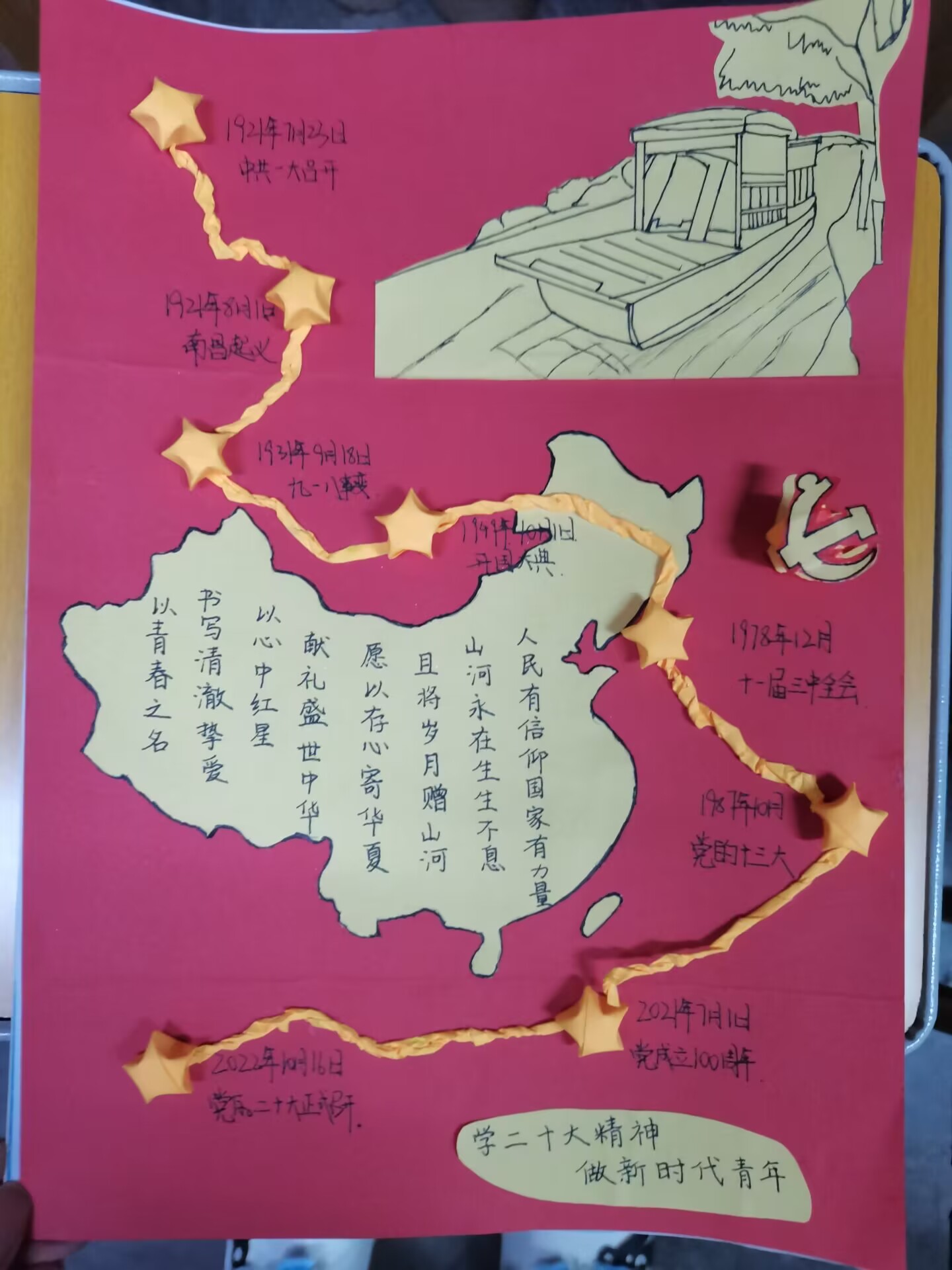活动前期,志愿者确定活动形式及主题,制定参赛规则并号召同学们积极报名参与。活动中期,同学们提前搜集资料,学习有关党的二十大的理论知识,并紧贴党的二十大主题,将对祖国的美好祝愿和对党的殷殷期盼寄于海报之中,别出心裁的设计与大胆的配色相结合,笔墨间尽显新时代青年的责任与担当,同时也渲染出“请党放心,强国有我”的铮铮誓言,坚定了永远跟党走,迈进新征程的决心。活动最后,同学们将电子版及纸质版作品按指示上交完毕,评委们秉持公平、公正、公开的原则对海报进行评比打分,最终评定出一等奖两名,二等奖三名,三等奖四名。