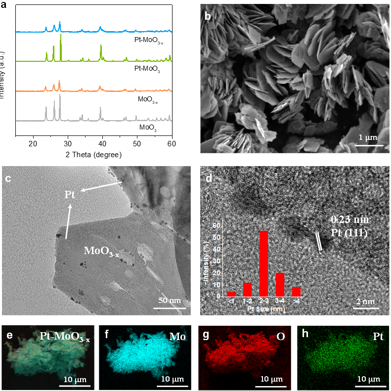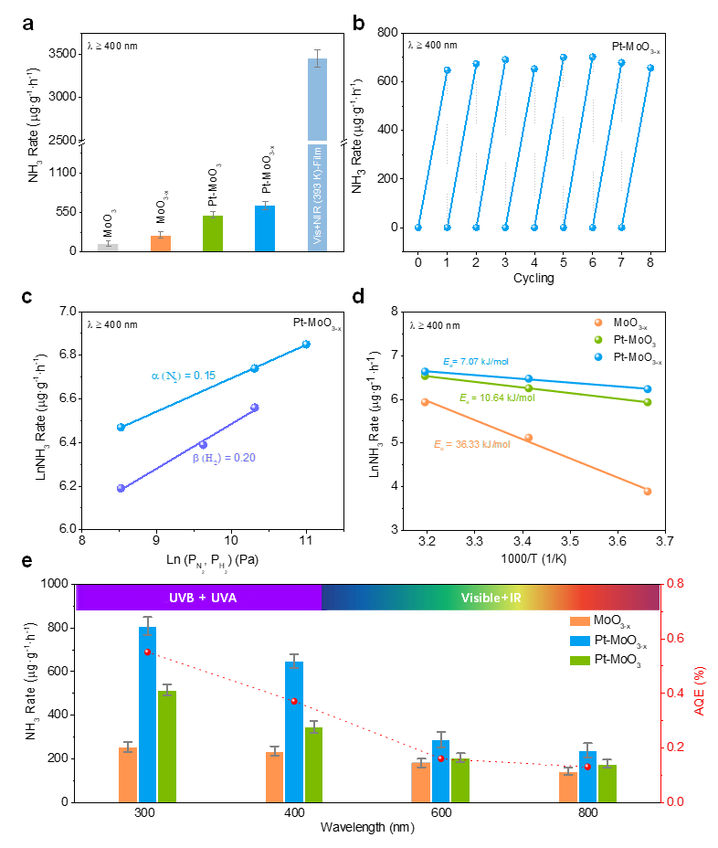 综上所述,本次工作通过双活性位点的协同效应,建立了一种高效的光催化氨合成策略。实验和理论证明,该策略在可见光照射下增强氮的氢化和氢的溢出。低价态Mo物种作为化学吸附氮的活性位点,为氮分子提供了更多的光电子能量,从而增强了氮气还原能力。负载的Pt纳米颗粒助催化剂可以引发氢溢出,促进氮氢化,进一步增加Mo(V)的活性位点,并形成肖特基势垒以高效传递光激发电子。该研究为环境条件下的光驱动氮还原提供了一种前景广阔的方法,并揭示了协同效应的重要性。