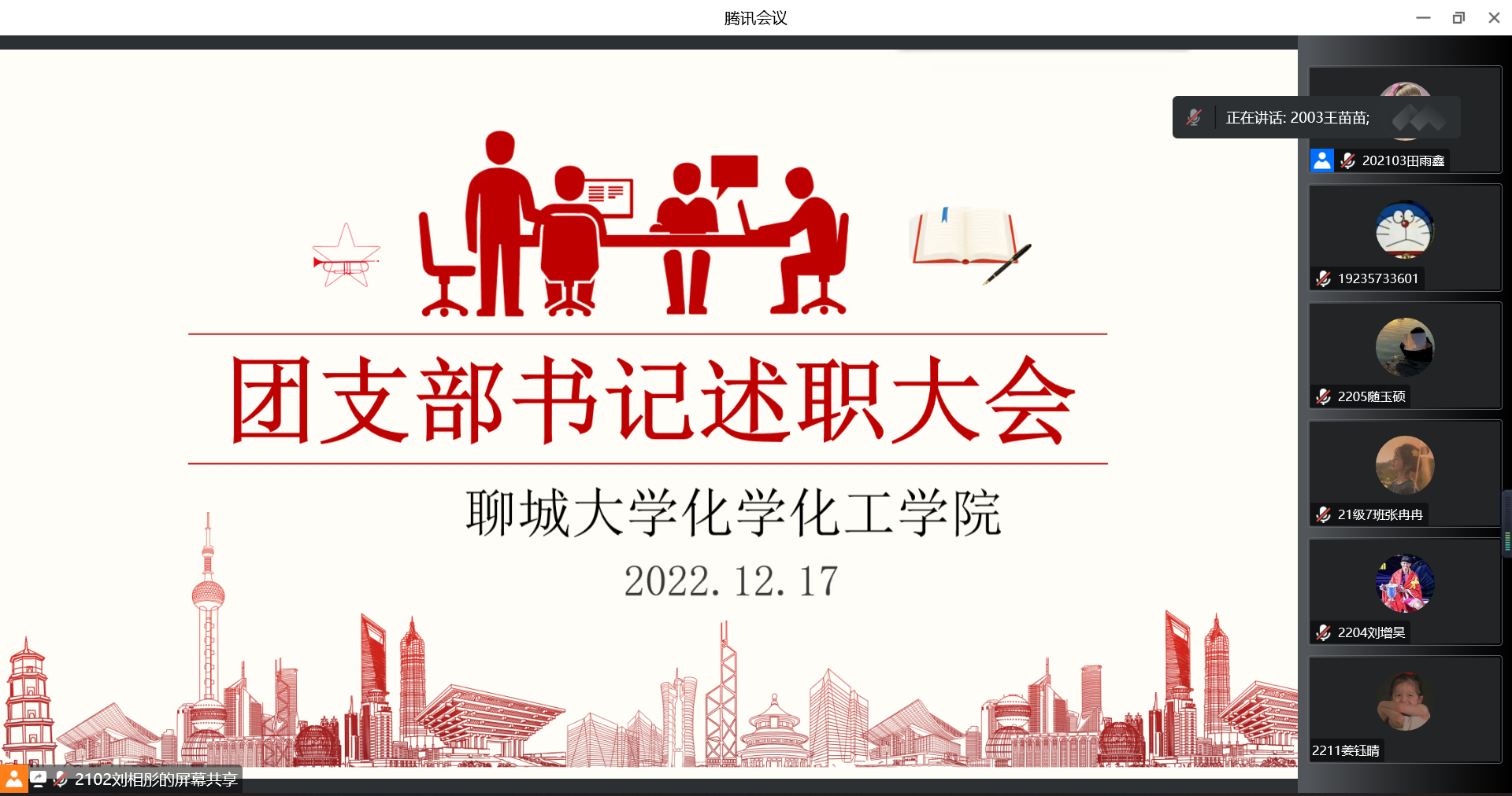 为深入贯彻落实党的二十大精神,切实加强团的组织建设,彰显团支部的政治功能和社会功能,增强各团组织的凝聚力与战斗力,广泛提高各团员学生的思想政治觉悟,促进团支部的工作顺利开展,12月17日,威廉希尔(WilliamHill)于线上举办团支部述职大会。本次大会由威廉希尔(WilliamHill)团委书记刘丽霞,辅导员赵艳敏、陈梦圆担任评委,2020级、2021级、2022级各班团支部书记参加。