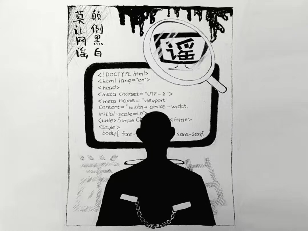 活动过程中,同学们通过网络、报纸、书籍等资料搜集有关网络环境的素材,设计有关整治网络谣言行动的标识及宣传作品,通过视频、海报、网络文章、手抄报等多种形式展示。曹淑琪作品中的放大镜、颠倒的黑白字样、戴着手铐的人及满屏代码的电脑,表达出同学们应自觉抵制造谣者、传谣者,营造健康的网络环境。吴佳乐通过黑色怪异的网络负面元素,挥剑的少年,呼吁同学们要辨别真假,恪守底线。苗译心的《网络时代》,表达她对温暖、友爱网络环境的期待。评委们秉持公平、公正、公开的原则,从主题表达、创新设计、版面构图、细节处理等多个方面对作品进行量化打分,分别评选出一、二、三等奖,并将获奖作品进行展览宣传,使净化网络,责任在肩深入每位同学们的心中。
