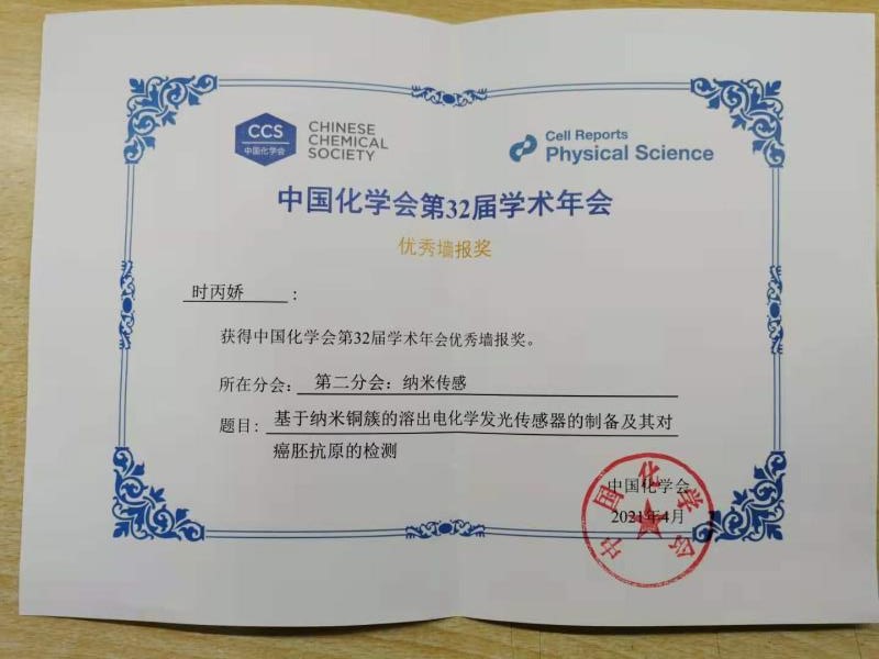 在刚刚结束的中国化学会第32届学术年会上,威廉希尔(WilliamHill)王怀生老师指导的2019级分析化学专业研究生时丙娇同学荣获第二分会(主题:纳米传感)优秀墙报奖。