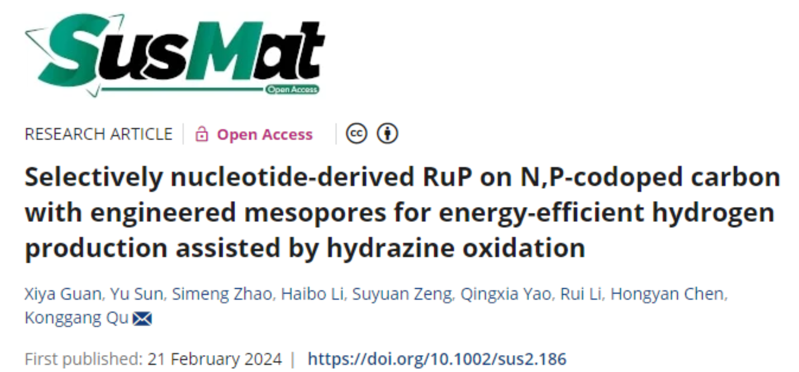 聊城大学曲孔岗课题组在SusMat(影响因子:28.4)发表了题为Selectively nucleotide-derived RuP on N,P-codoped carbon with engineered mesopores for energy-efficient hydrogen production assisted by hydrazine oxidation的研究论文,利用具有超低理论氧化电位的肼氧化反应取代析氧反应来降低整体电势,在钌基纳米材料用于肼氧化辅助的节能型制氢领域取得突破。
