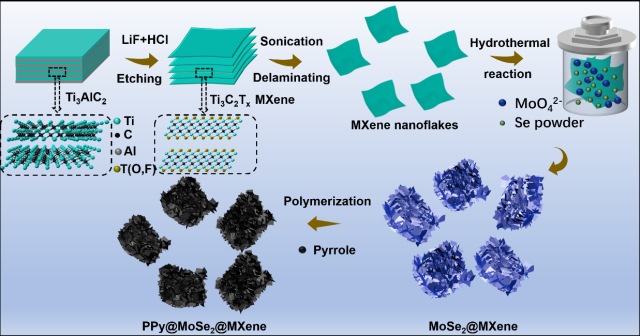 示意图1 PPy@MoSe2@MXene的合成路线示意图。