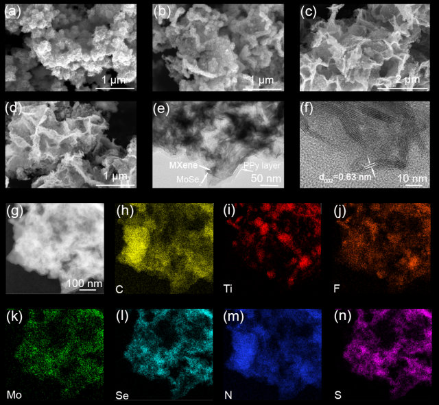 1.aMoSe2、(BMoSe2@MXene和(c-dPPy@MoSe2@MXeneSEM图像,PPy@MoSe2@MXene的(eTEM、(fHRTEM和(gHAADFPPy@MoSe2@MXeneCh)、Tii)、Fj)、Mok)、Sel)、Nm)和Sm)元素的相应映射图像。