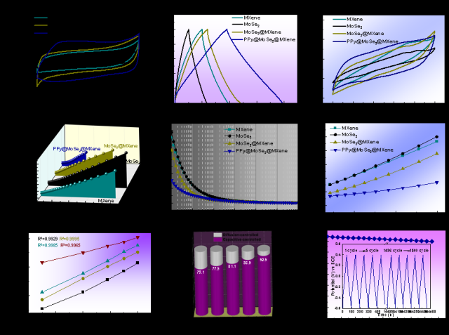 要点2:电化学测试表明,PPy@MoSe2@MXene电极在1 M NaCl溶液中展现出优异的电化学性能。循环伏安(CV)和恒流充放电(GCD)测试显示,该复合材料具有最高的比电容(189 F g−1)和最低的电荷传输电阻(Rct),表明其快速的离子传输能力和高效的电荷存储特性。此外,PPy@MoSe2@MXene电极在不同扫描速率下展现出良好的电化学可逆性,且在1500次循环后保持了92%的初始电容,显示出优异的稳定性。