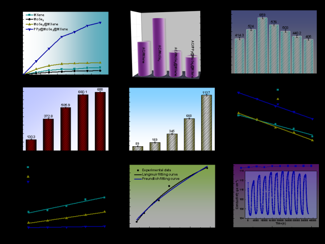 要点3:在300 mg L−1 UO2(NO3)2溶液中,PPy@MoSe2@MXene电极展现出卓越的铀提取能力,提取容量高达659 mg g−1,远高于其他对照组。此外,该材料在不同pH值下表现出最佳的铀提取性能(pH=5),且在不同电压下展现出高效的铀捕获能力。动力学模型分析表明,铀的吸附过程涉及物理吸附和化学吸附的协同作用,且PPy@MoSe2@MXene电极在低浓度铀溶液中展现出更高的吸附效率。经过多次吸附-解吸循环实验,PPy@MoSe2@MXene电极仍保持较高的铀提取能力,10次循环后吸附容量为276 mg g−1,占初始容量的80%。这表明该材料具有良好的可重复使用性,适合实际应用中的铀提取。