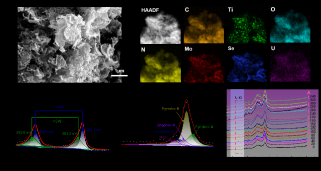 要点4:原位拉曼光谱揭示了PPy@MoSe2@MXene在铀提取过程中的动态变化。在吸附过程中,材料表面逐渐出现U-O键的特征峰(715 cm1),表明UO22+离子被成功还原为UO2并储存在材料内部。这一结果进一步证实了PPy@MoSe2@MXene在铀提取过程中通过赝电容嵌入和电沉积的协同作用实现高效的铀捕获。